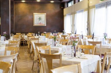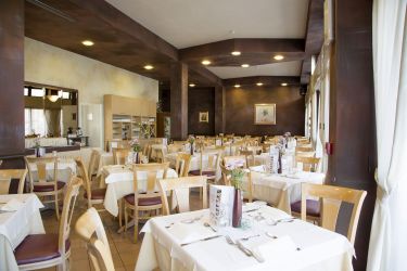 La sala del ristorante può ospitare fino a 140 persone, i gruppi che soggiornano presso Hotel Meeting e la clientela individuale dell'Hotel Meeting e dell'Hotel Primavera.